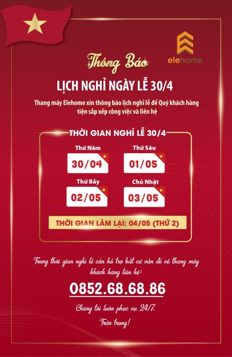 Hòa chung không khí hân hoan của cả nước chào mừng kỷ niệm ngày Giải phóng miền Nam và Quốc tế Lao động, Thang máy Elehome xin trân trọng thông báo lịch nghỉ lễ cụ thể như sau: